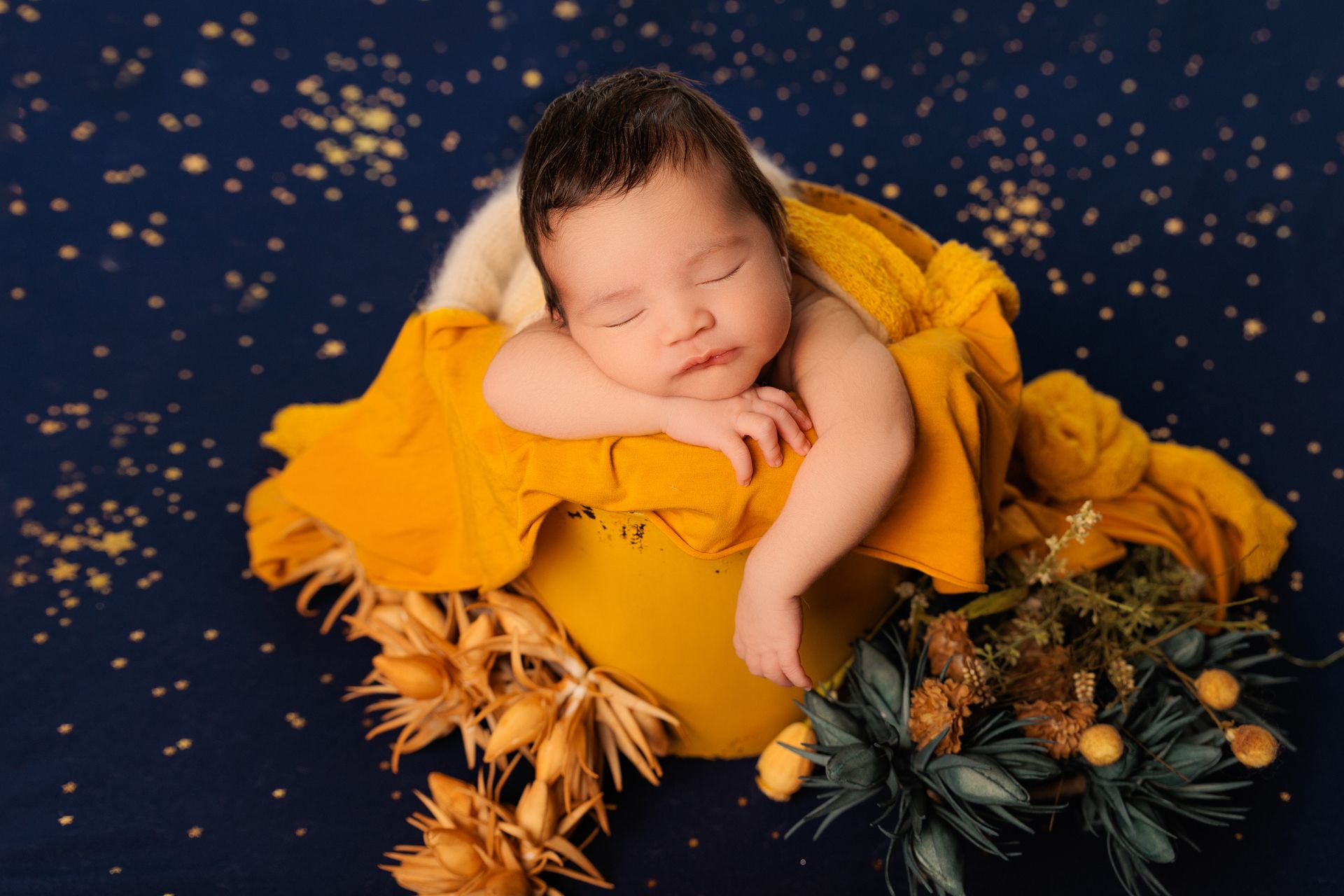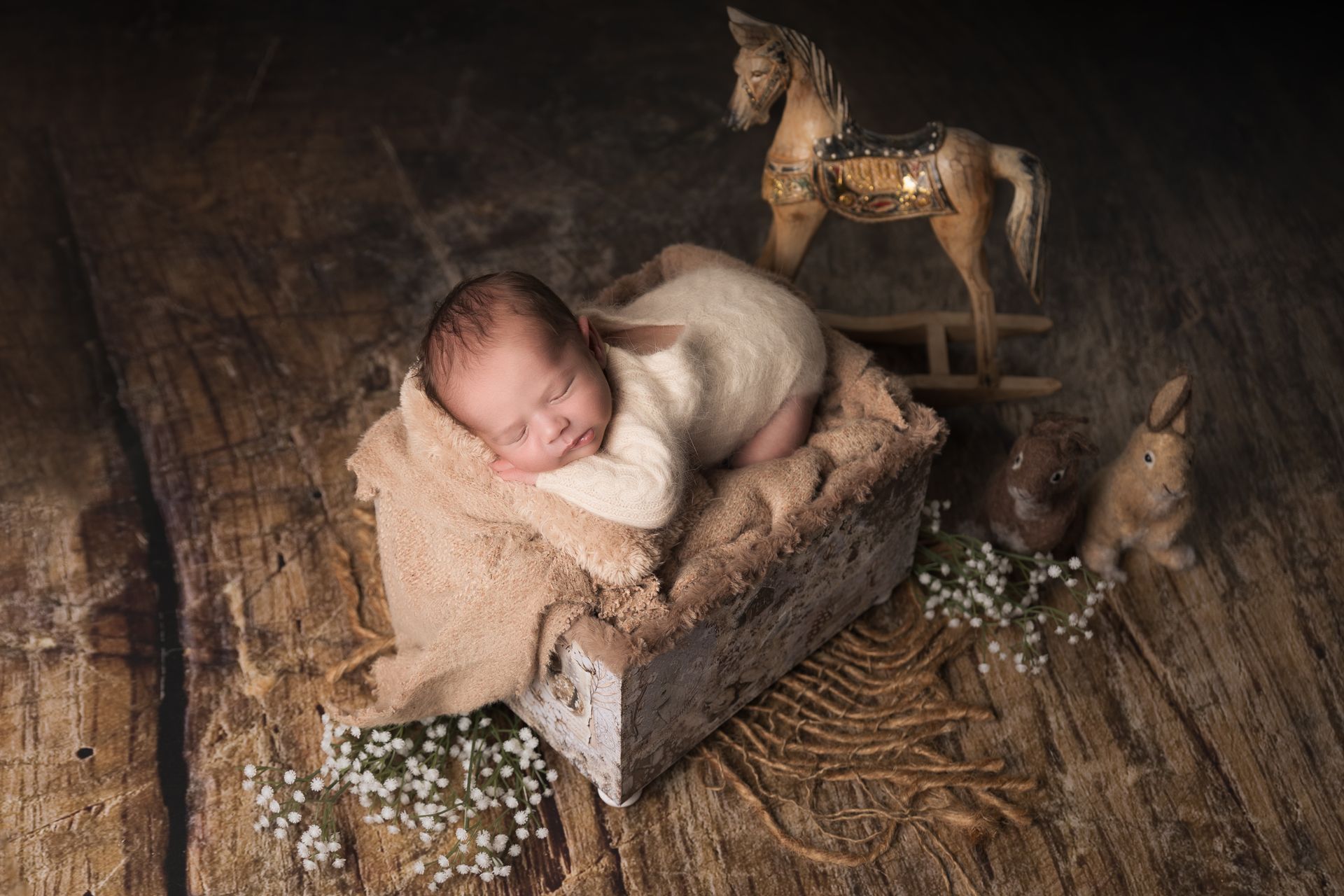- Prises de vues de bébé seul en posing + 2 mises en scène en contenants, ainsi que quelques photos de fratrie ainsi qu'en famille